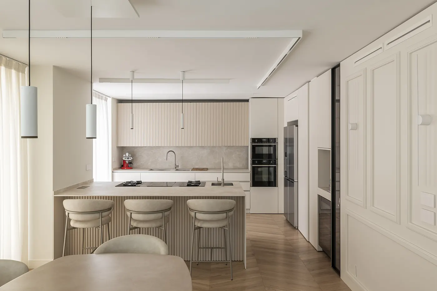 Il piano terra è stato dedicato alla zona giorno, con un particolare focus sulla grande cucina abitabile, cuore della villa, in cui campeggia un grande tavolo, che ben simboleggia il calore famigliare, ed un’ampia area tecnica ma estetica, in ossequio alla passione per l’arte culinaria dei padroni di casa. Inframmezzato dall’ingresso con scenografica scala di collegamento tra i due livelli e ampio vano guardaroba e scarpiere (ben nascosto grazie ad accorgimenti progettuali strategici, ma presente), vi è poi un grande salone con zona divani, TV e tavolo per cene eleganti, con arredi progettati in modo sartoriale e realizzati in falegnameria. Dalla cucina, dall’ingresso e dalla sala è possibile accedere ad un corridoio di servizio su cui affacciano gli accessi al bagno della zona giorno, alla lavanderia, alla cantina vini, in modo da rendere possibile un movimento circolare all’interno del piano, che consente l’agile raggiungimento di ogni locale, ovunque ci si trovi.