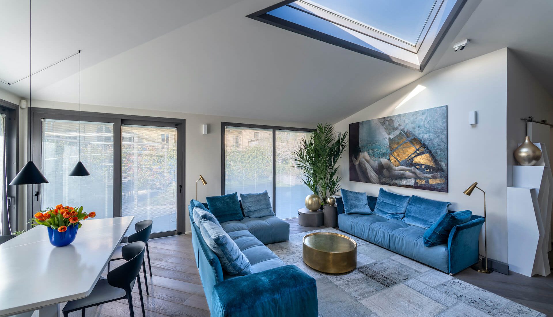 Elemento emotivamente caratterizzante di questa villa sul tetto è il senso di leggerezza e armonia che l’ambiente trasmette, grazie alla luce che la inonda ed anche alla percezione che non vi siano barriere a separare il dentro dal fuori: ampie superfici vetrate “dissolvono” l’involucro portando all’interno dell’abitazione la bellezza del giardino esterno, con il suo prato inglese, i suoi alberi da frutto e i cespugli fioriti, cornice inimmaginabile per un appartamento nel  centro di Torino.
